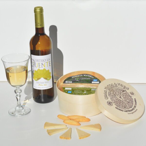 Lote compuesto por una botella de Blanco Afrutado Seco, medio Queso Emborrizado y medio queso reserva natural.